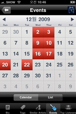 아티스트의 일정을 보고 싶다면 하단의 events클릭.