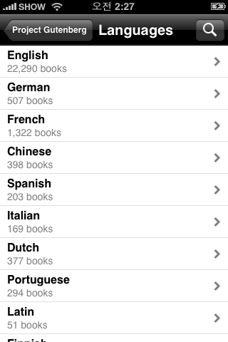 Project Gutenberg는 아래 화면에서 볼 수 있는 것처럼 여러 국가의 책을 모아두고 있다.