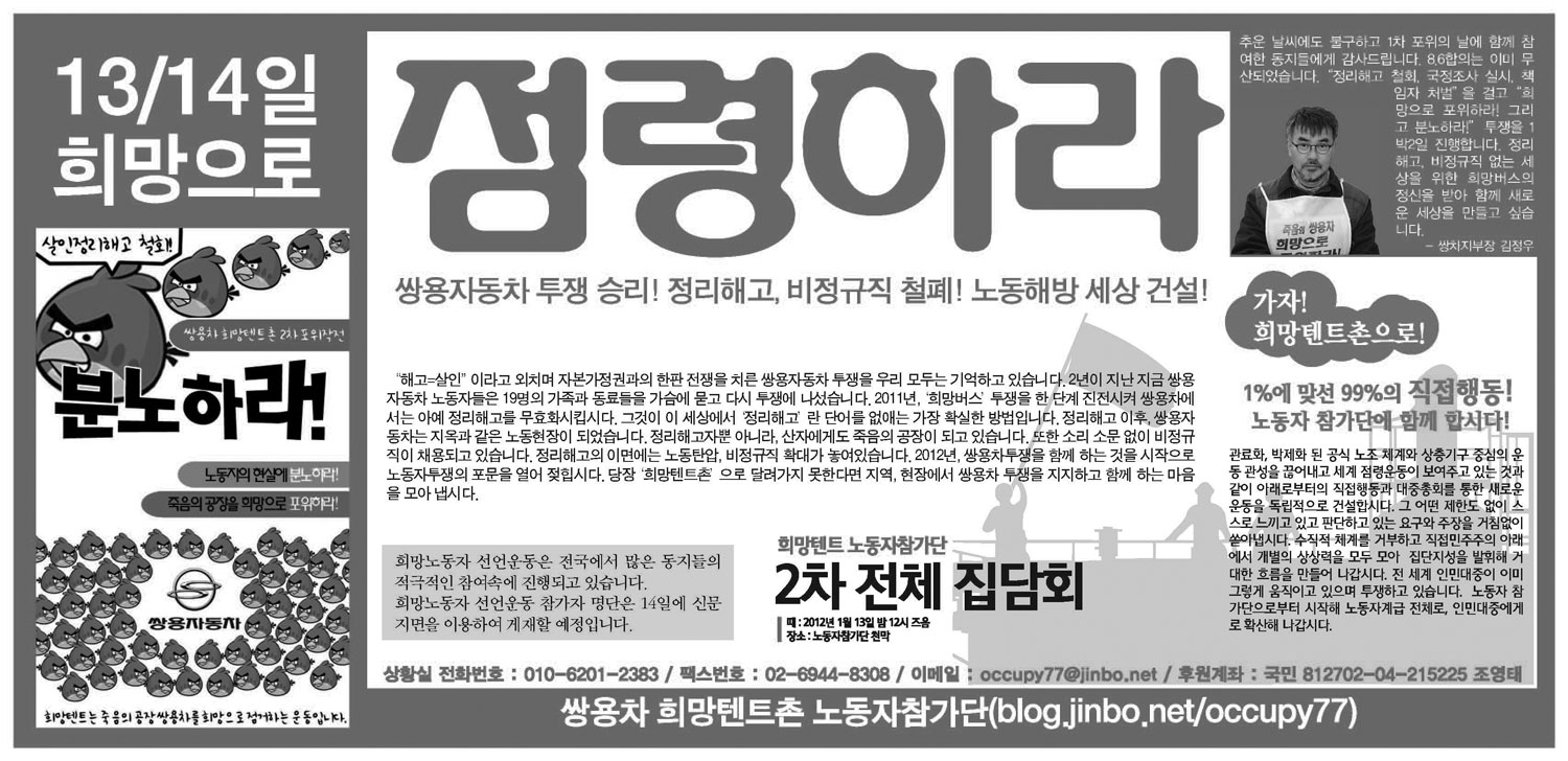 위와 같은 이유로 참여명단 신문게재가 하루 연기됨에 따라 희망노동자 선언운동에 참여하기 원하는 단체나 개인은 12일 자정까지 팩스나 메일로 명단을 보내주시기 바랍니다.