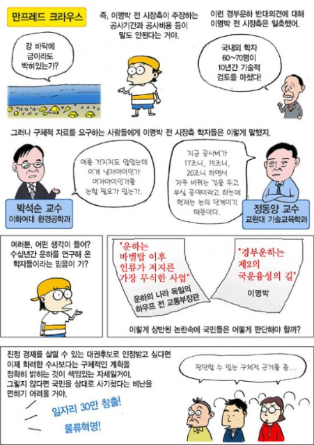 이명박씨는 이 막대한 수해 피해에 대한 대책이 있을까. 아마도 그는 운하가 연결되는 전 지역에 지금보다 높은 콘크리트 제방을 쌓자고 주장할지도 모른다. 건설 경기와 고용을 들먹거리면서 말이다.