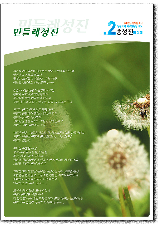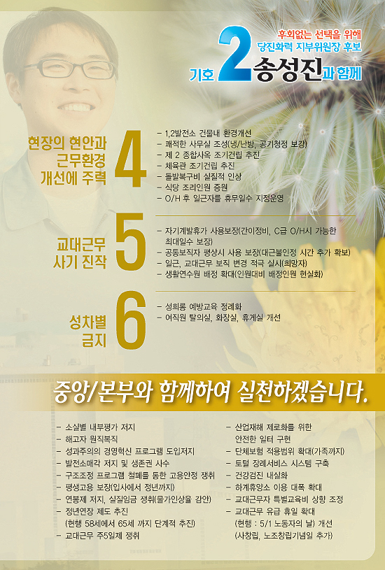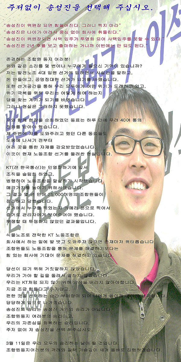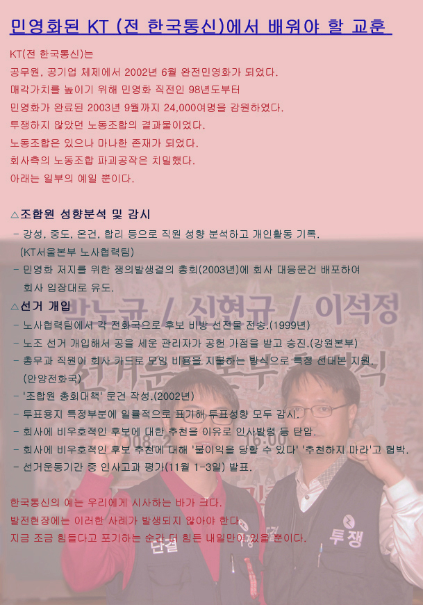 민주노총 홈페이지에 들어갔다가 발전노조 선거와 관련한 어느 후보의 동영상을 보았습니다. 그들은 한통 비정규직 투쟁을 상투적인 투쟁이었다고 비하하는 한편, 지금도 계속되고 있는 GS 칼텍스 해고자들의 투쟁(동영상은 해고자들의 고공농성장면)을 보여주며 국민 여론 앞에 굴복한 투쟁이라고 사실을 왜곡하고 있었습니다. 너무도 어이가 없고 기가 막힙니다. 그들이 구체적으로 어떤 얘기를 하고 있는지 알고 싶어 선거홍보물을 구해 읽어보았습니다. ‘선수교체’팀의 선거홍보물을 펼쳐 읽는 순간, 한통이 민주노조에서 어용노조로 넘어가던 과정이 생생하게 떠올랐습니다. 발전노조 동지들이 우리와 같은 일을 되풀이 하지 않기를 바라는 심정으로 이 글을 씁니다.