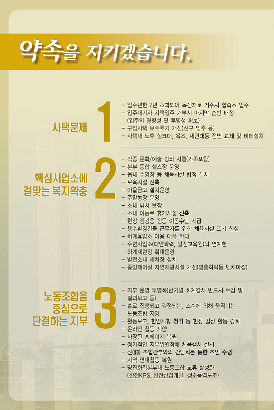 이번 선거 절대로 패하지 마십시오. 동지들도 경험했겠지만, 집행부를 장악하지 못하면 아무리 높은 이상 옳은 생각도 휴지조각이 되고 맙니다. 동지들이 이번 선거에서 반드시 이겨야 발전소매각을 막아낼 수 있습니다. 조합원들과 함께 승리하는 투쟁을 이번에 만들어 내지 못하면 더 이상 발전노조의 미래는 없다는 것을 감히 말씀드리며 멀리서 동지들의 승리를 기원합니다.