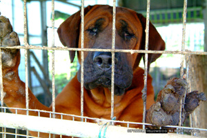 ▲ 식용 개 농장에 함께 갇혀, 마주보고 위로를 나누는 시베리안허스키와 도사견